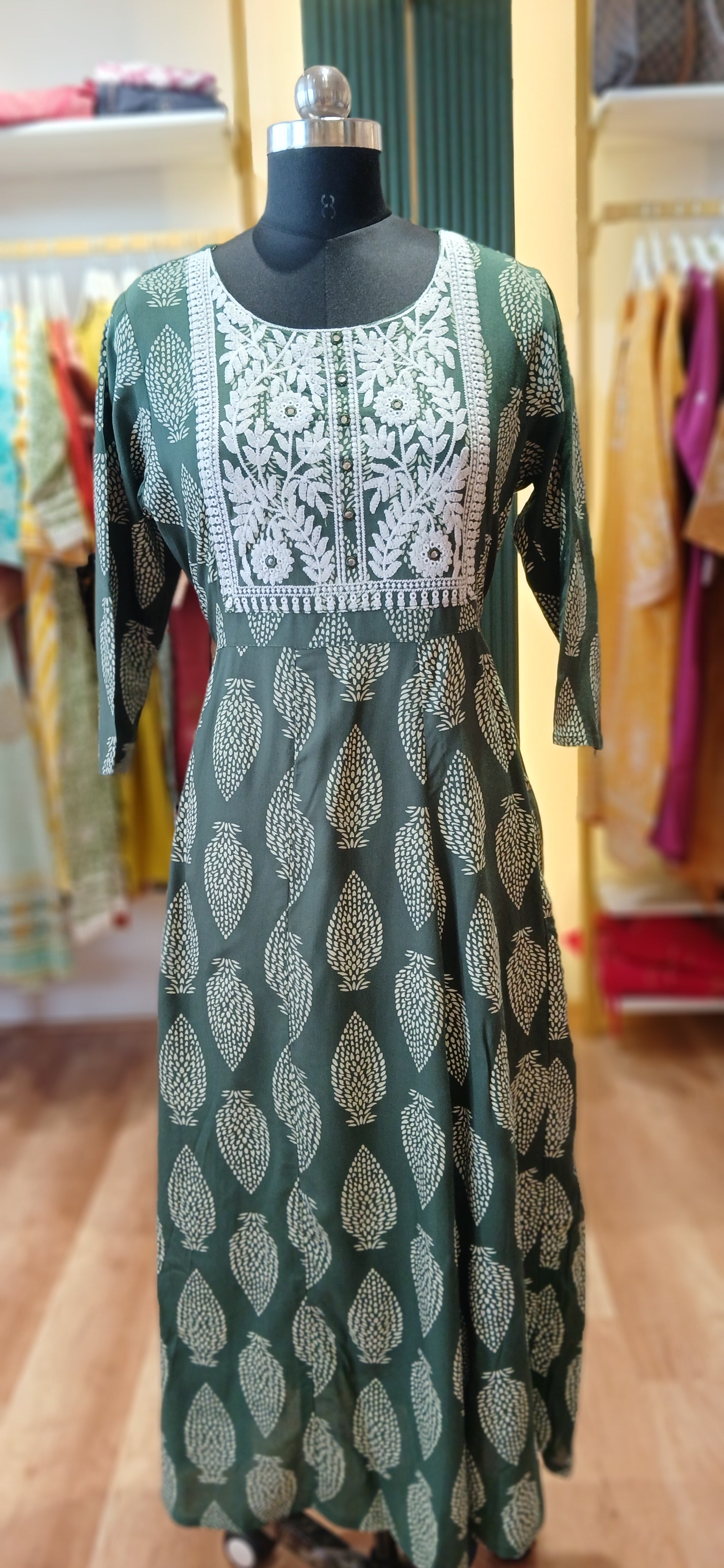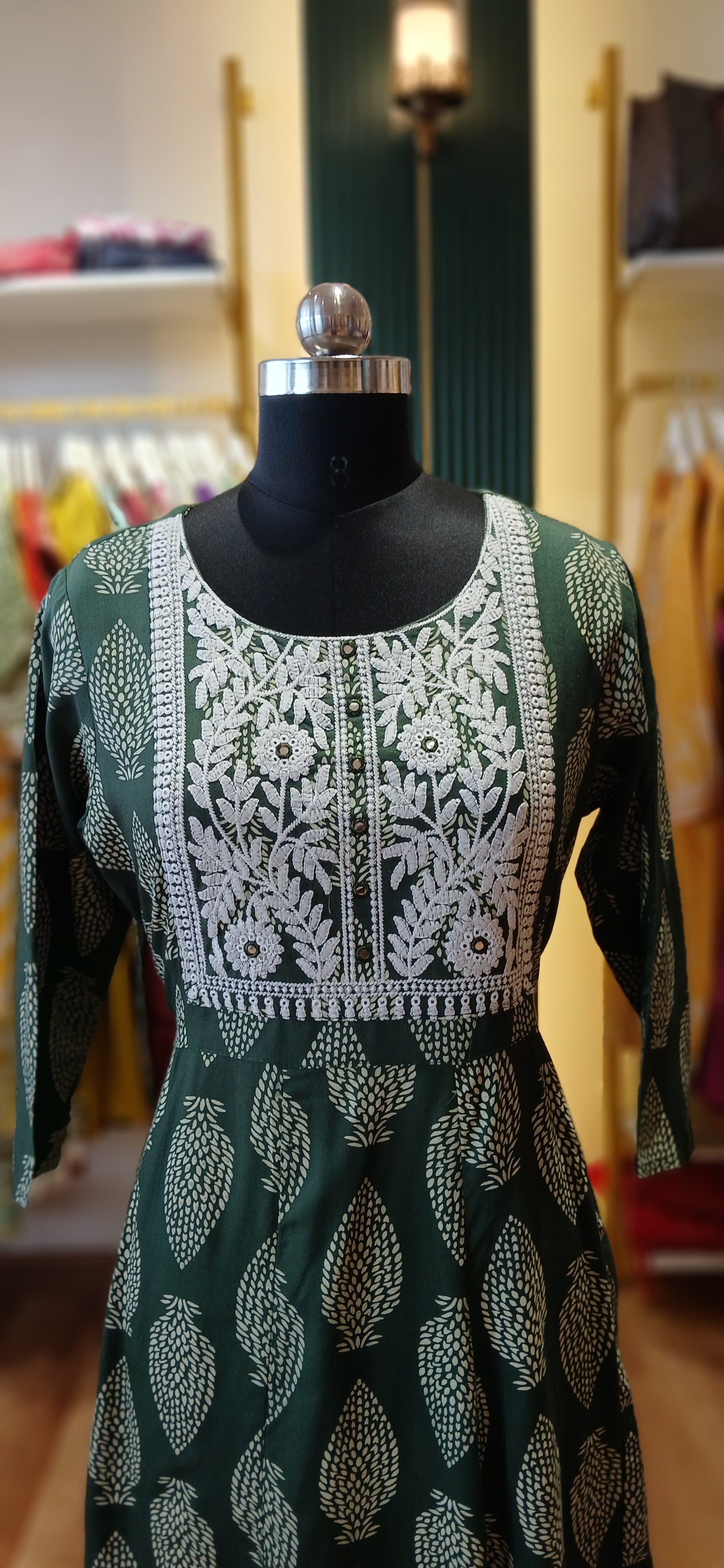 Cotton fabric self Printed with elegant embroidery designed Kurtis